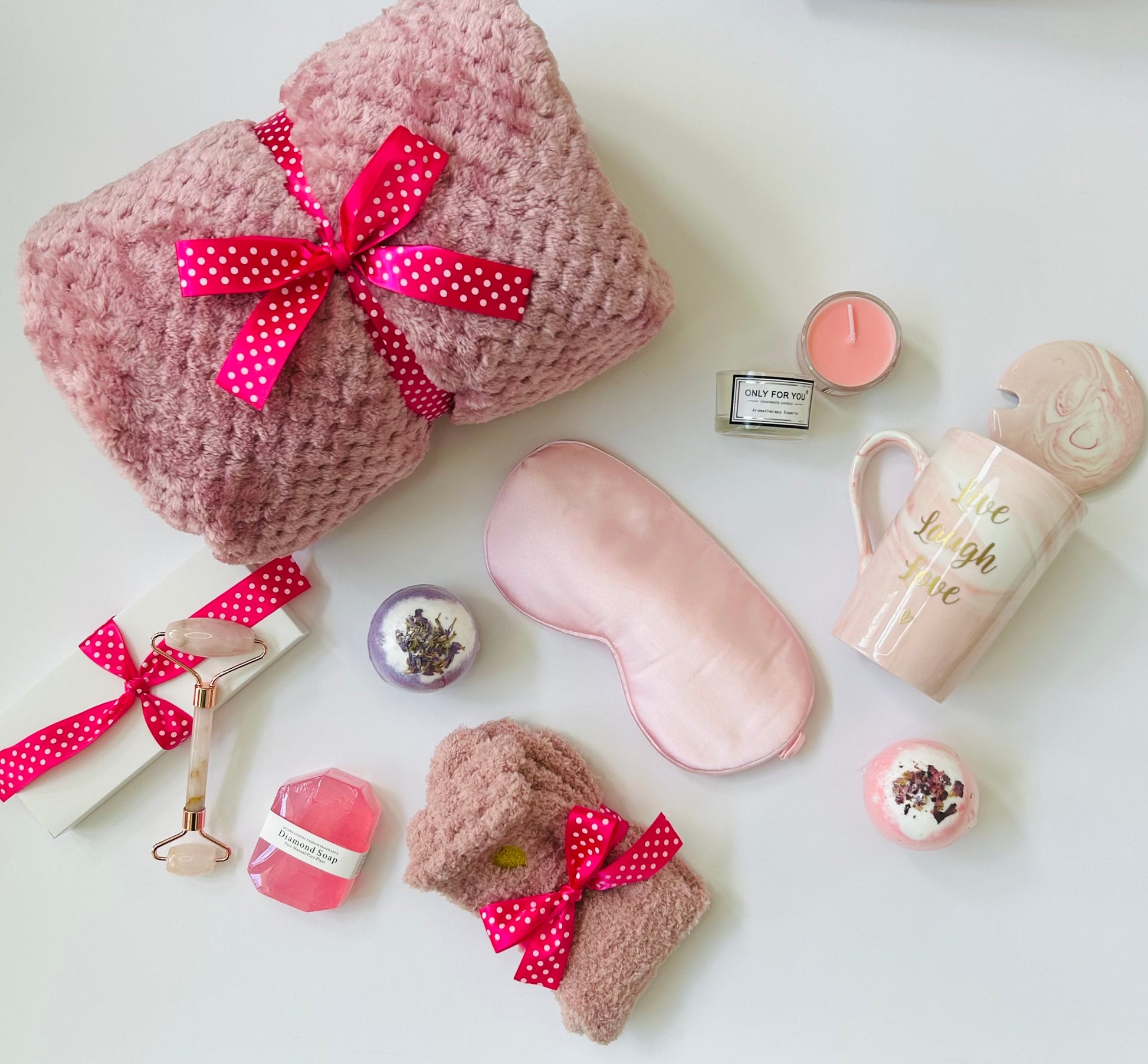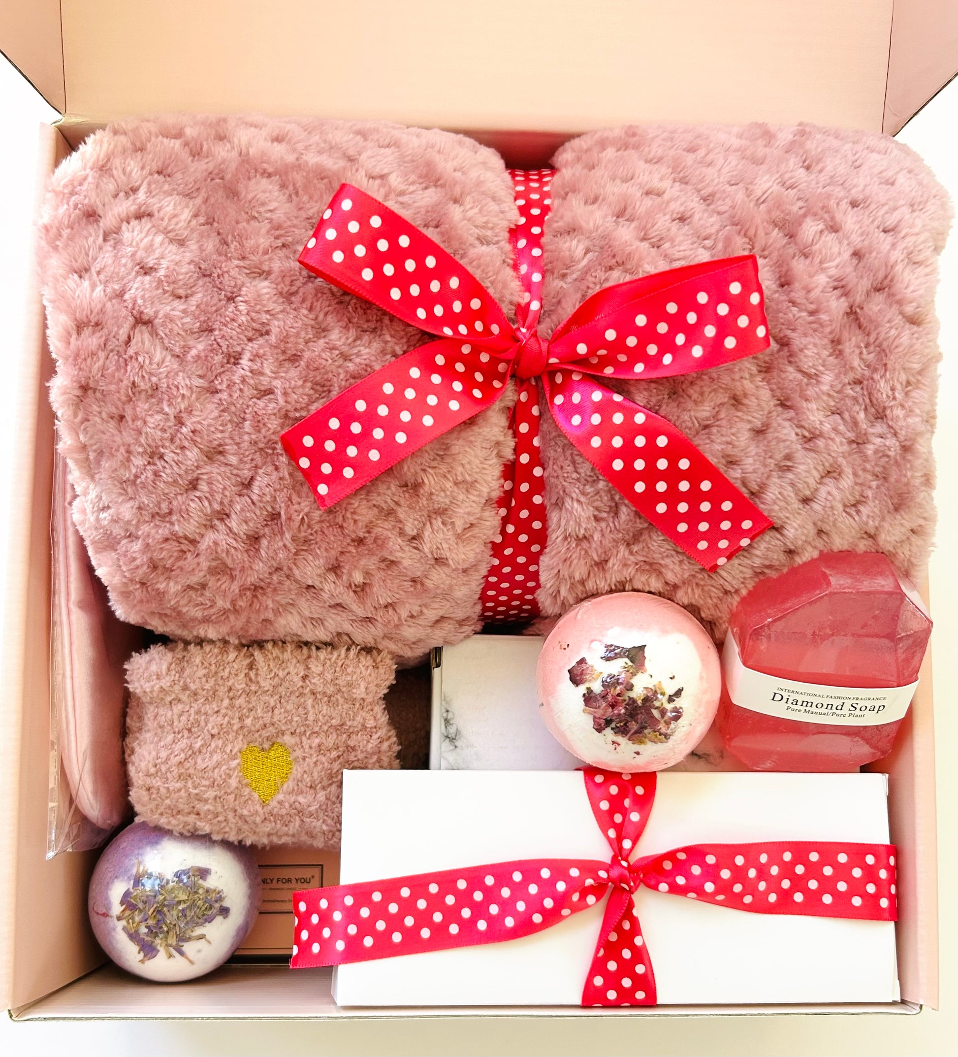 Elevate her moments of rest and reflection with the Blushing Glow self-care gift box, thoughtfully curated to inspire serenity and renewal. This elegant collection features a plush throw blanket, soothing jade roller, luxurious cozy socks, and a handcrafted ceramic mug with spoon for comforting sips. Indulge the senses with aromatic candles, calming bath salt balls, a gentle eye mask, and radiant diamond soap—each element designed to foster peace and uplift the spirit with grace and warmth.